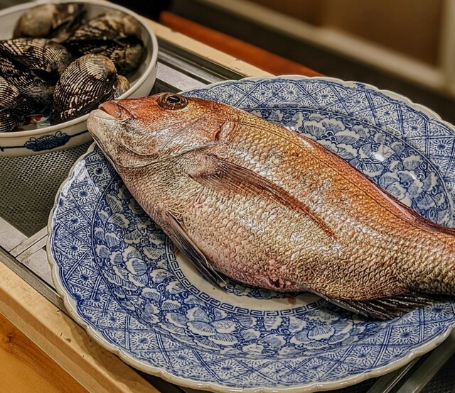 巨大赤貝と、頂く時間に合わせて藤本さんが仕立てた見事な真鯛さま。