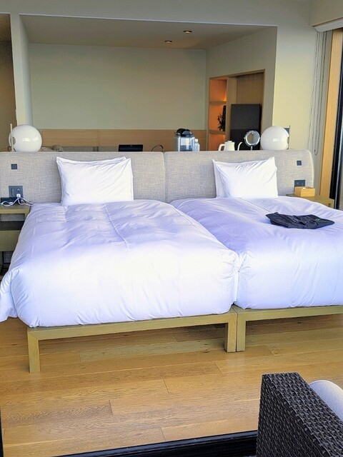 海に向かったベット。一人で超贅沢。ベットの向こうに広々とリビング。供え付けの冷蔵庫のフリードリンクは私向けに全てソフトドリンクに変えて下さってました。