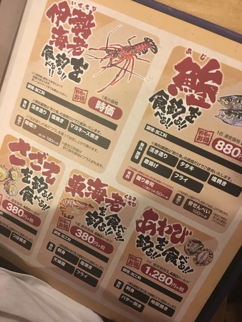 鯛、ヒラメ、伊勢海老、アジ、アワビ、車海老、さざえ