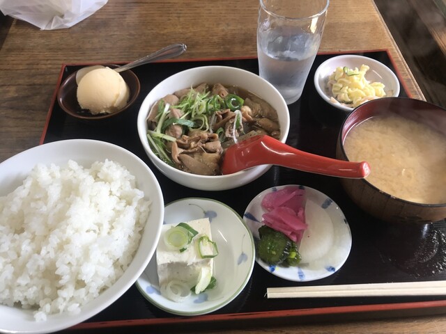 もつ煮定食_冷奴、漬物、ごぼうサラダ、アイスクリーム付(600円)