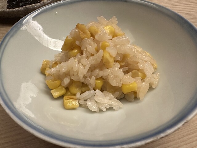 最後はとうもろこしご飯、カツ、カレー蕎麦で締め。