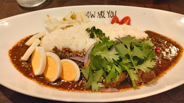 15分ほどで提供されました。ゴロゴロのラム肉が入ったカレーで、ラムはやや硬い部分もありましたが、非常に美味でした。ラムとゆで卵の他に、フレッシュトマト、パクチー、紫タマネギ、キャベツの酢漬けなど色々なものが乗っており、最後まで飽きずにあっという間に食べ終わりました。今回の大辛は前回より明らかに辛く、そこに青唐辛子も加わったため、大汗をかいてしまいました。次回からタオルを持参したいと思います。