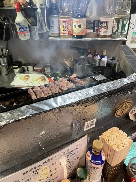 空いていたコンロ前カウンターに並び、やきとんやお刺身盛り合わせを注文。