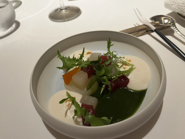 アミューズは、トマトやカブ、ビーツのお野菜と、小さなパンです。お野菜の自然の甘さが引き立つ、...