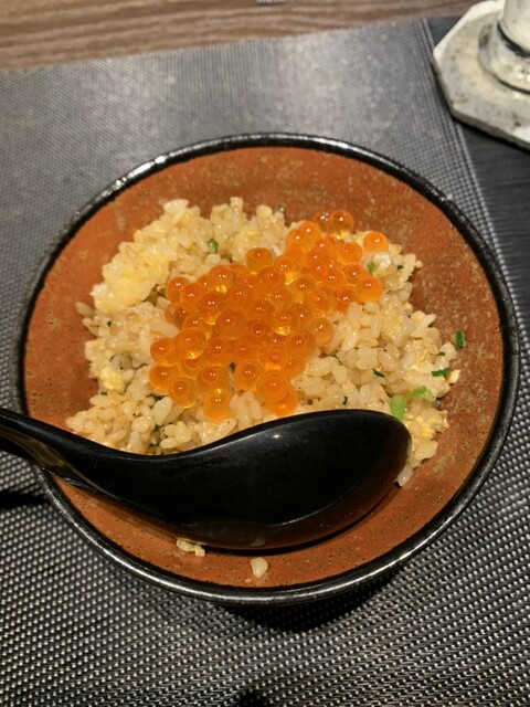 〆はイクラがトッピングされたガーリックライス。生姜が効いていて美味しかった。