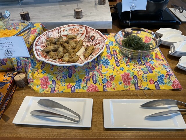 ハム、チーズ、沖縄料理、和食、ジュースなどが準備されています。