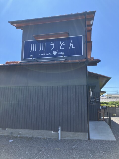 お店外観。うどんの絵のデザイン部分が川川、と店名になっている