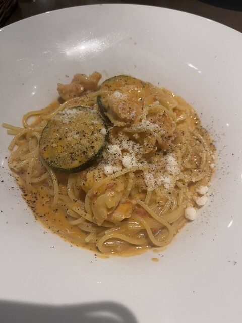 私はエビとズッキーニのパスタにしました