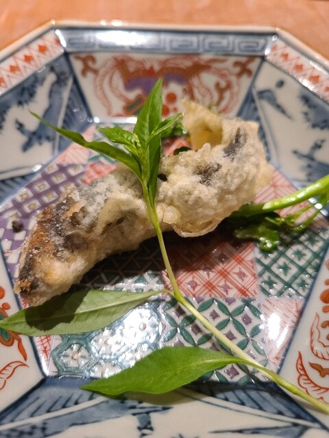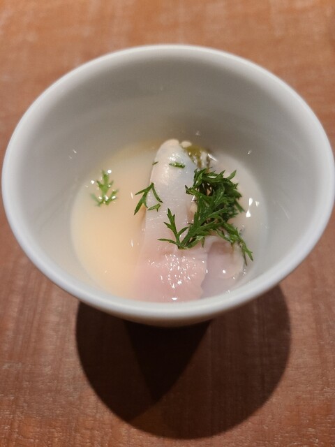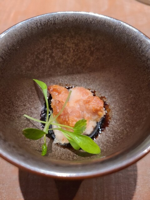 フグの骨からとった出汁がかかっていて、炙ったフグの身が乗っている。