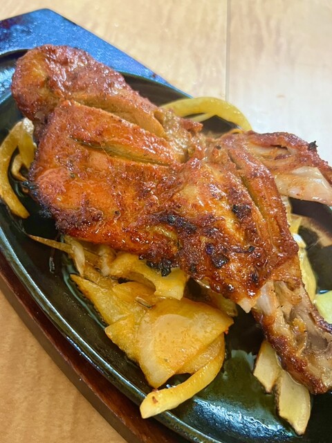 鉄板皿にのって登場したタンドリーチキンはアツアツのジュージュー。視覚と聴覚でもうすでにヤラレました(^^)スライスオニオンの上にチキンレッグがドーンとのっています。