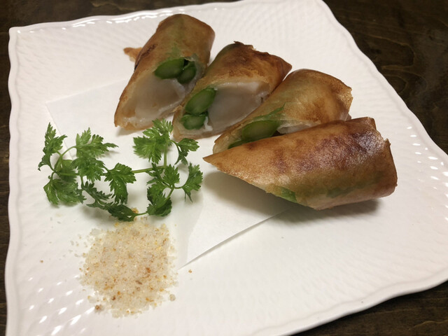 ずっと食べたかった“帆立春巻”…ミディアムレアで揚がった帆立貝柱とホクホクのアスパラがパリパリの皮に包まれて食感も味覚も美味しい。柚子塩を付けてあっさりと。