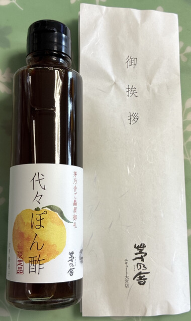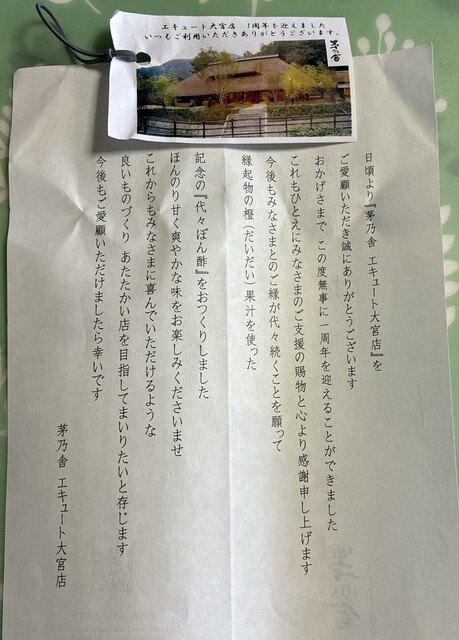 ハガキをいただき大宮店一周年記念品の“代々ぽん酢”いただきました。