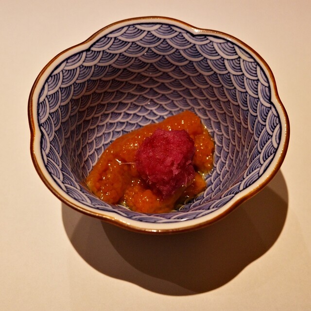出汁のジュレとウニ、スルメイカのマリアージュを楽しみました。こういう組み合わせは初めてです。