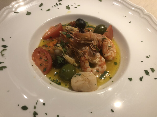 アクアパッツァには有頭エビも入っており、スープのお味は想像通りこれまでの延長線上にあり、美味しい。金目の白身をスープと共に完食。