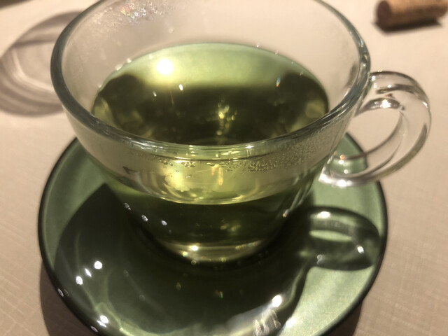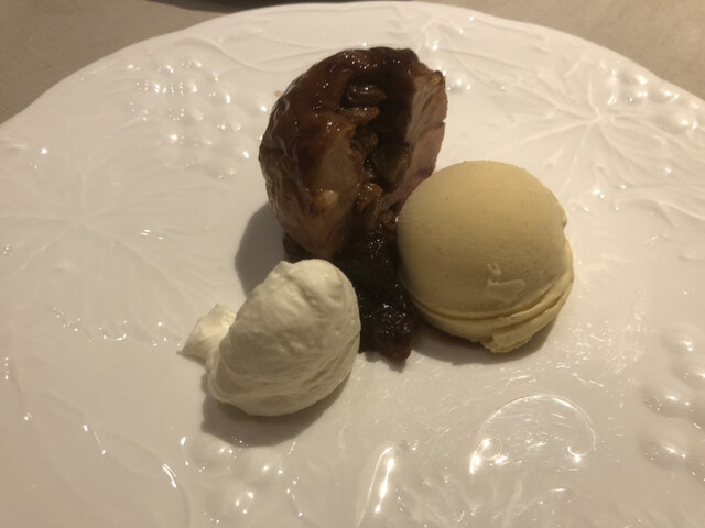 終いに控えしはデザート。お腹もいっぱいでもあり、焼きりんごを半分、そこにバニラアイスを添えてもらいました。バニラアイスは美味しいアッピア味。焼きリンゴも丁寧に酸味のあるりんごを焼いてあり、頼んで良かったなと満足に浸っていると、生葉のハーブティーが添えられました。