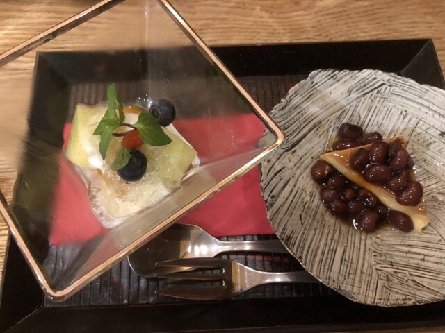 3種(びわ、桃、メロン)のコンポートとブリンの小豆(カラメル風味)載せ