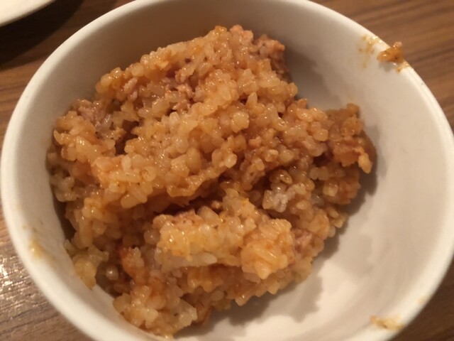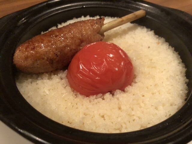 サプライズはチキンライス。つくねのように焼いたチキンと焼きトマト、炊いたご飯を食べる直前に良く混ぜます(勿論お店の方が混ぜて下さいます)。酸味もあり美味しい。味変は香辛料。これ混ぜると辛さも出て美味。