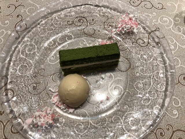 抹茶香る甘さ控えめなケーキ。トッピングの抹茶の苦さもマッチング。豆乳のアイスはさっぱり感を演出。お茶と共に頂きました。