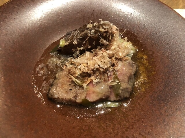 熊野のサーロインとカイノミ鰹節と共に。里芋と青菜が付け合わせ。ネギのあんが和風に!何故か食べれてしまいます。アンが肉の油を優しく包んでる?