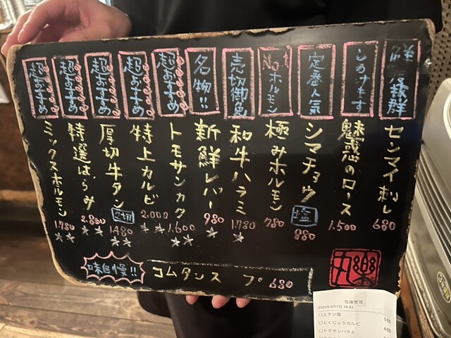 だいじゅんカルビ、上たん塩、ハラミちゃん、極みホルモン、ミノもんた、新鮮レバー、幸せロース、ミックスホルモンで、フィニッシュ!