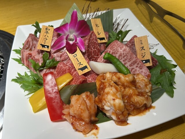 ランチの「贅沢A5特選和牛コース」を美味しく頂きました!全てが黒毛和牛のロース、ヒレ、ハラミ、ミスジ、ミノ、シマチョウのコースで、どれも美味い!特に、黒毛和牛のミノやホルモンは、甘くて今まで食べたホルモンでもトップクラスの美味さ!流石、一頭買付けをしているからこそ、出来る技ですネ