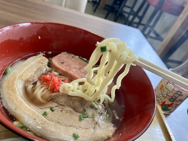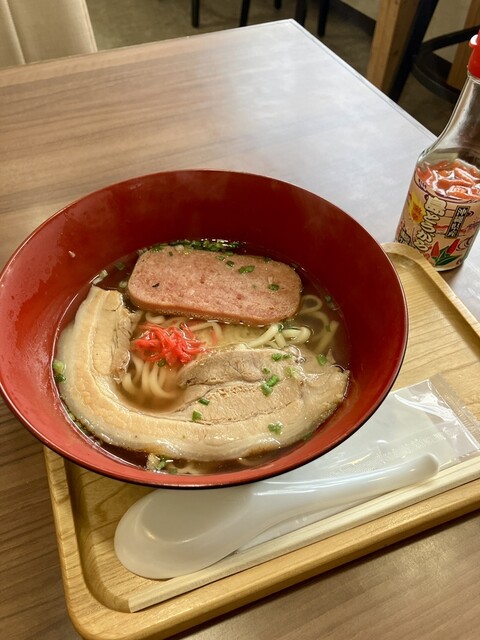 せっかく来たなら沖縄ソーキそばも食べてみようと注文(1,000円)。『月曜から夜ふかし』の嫁ニーさんがプロデュースのタイラ製麺所の麺なんですね!ソーキそばにもスパムが入っていて、とても美味しかったです!