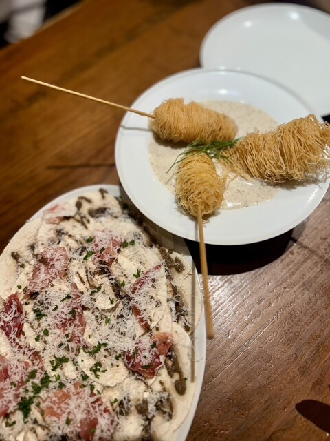 ハマりにハマったマッシュルームのサラダと、鮮魚のパリパリ揚げマッシュルームソースのやつ。これは、絶対食べたくて注文。