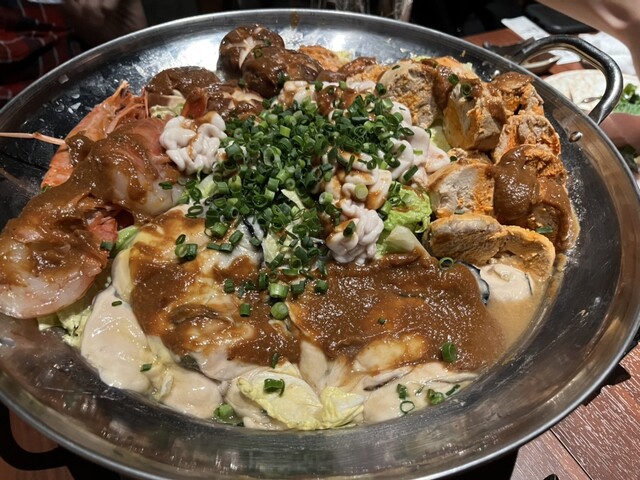 運ばれてきてまずそのボリュームに驚き。4人前相当の量がある。火をつけてグツグツしたら弱火にして全体に火が通るようにとのこと。あん肝はまろやかで味に深みがある、赤エビは身がしっかり詰まっている、ほかの具材もしっかり主張があって味噌ダレによく絡んでいた。