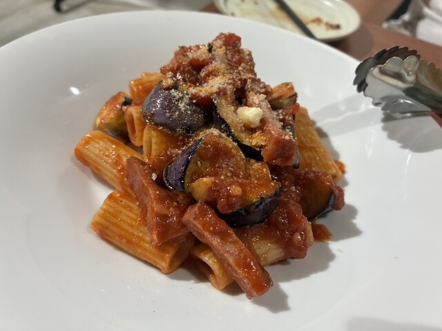 ・ナスとベーコンのトマトソース(ショートパスタ)
