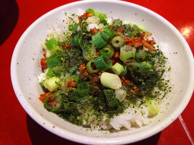 今回お初の辛ねぎチャーシューまぶしはライスに青のり、みじん切りのチャーシュー、唐辛子パウダー?!が乗ってます!