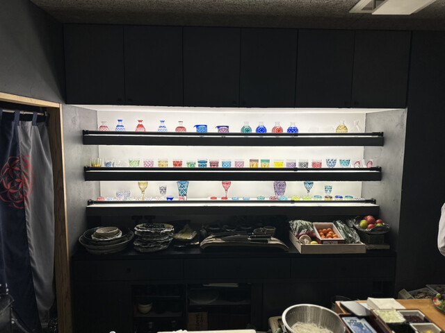 カウンターからは前後には薩摩切子。