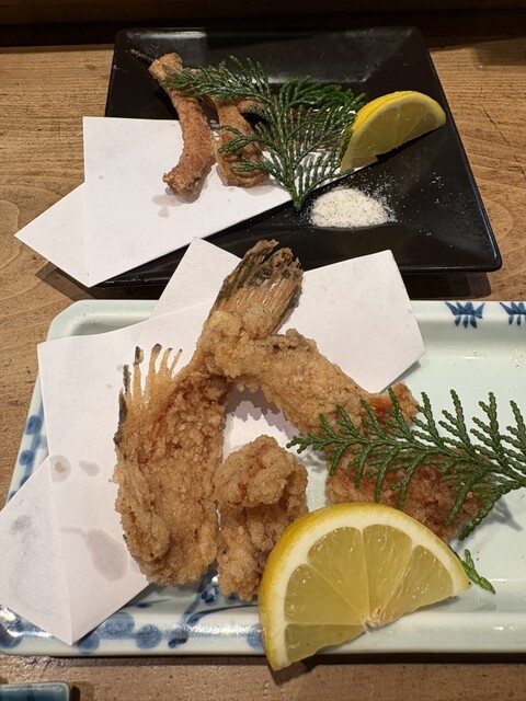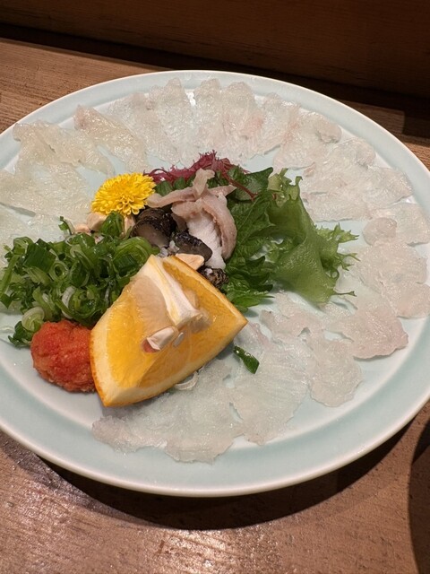 オコゼは贅沢に2枚くらい取って口に運ぶとプリプリっとして薄造りにしても身の反発力がすごい。新鮮だからこそ肝や内臓もいただける。