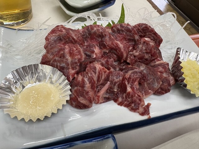 あとは刺し盛り上一人前とくじら刺し、黒ハンペンのフライをオーダー。とにかくくじらが美味い!ねっとりとした食感は魚とも牛肉とも違いまさにくじら。筋も無くとても良いくじらは大分の甘い醤油とにんにくしょうがに抜群に合う。