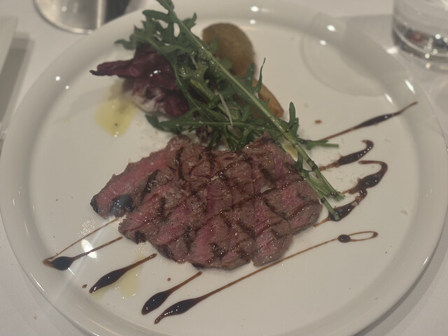 魚料理の「真鯛」は皮目がパリッと香ばしく、身はふっくらとした火入れ。メインの「黒毛和牛のタリアータ」は脂ののりが良く、噛むたびに旨味が広がる満足度の高い一皿でした。