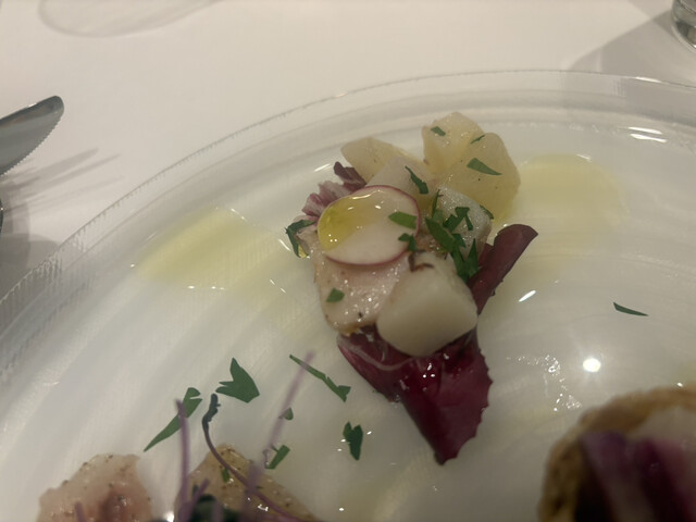 まずは「リコッタチーズとキャビア」からスタート。なめらかでミルキーなリコッタに、キャビアの程よい塩味が加わり、シンプルながらも贅沢な組み合わせです。「本日の前菜5種盛り合わせ」に続き、「ムール貝とマッシュルームのココット」は貝の旨味とキノコの香りが溶け込んだ優しい味わいで、じんわりと美味しさが広がります。
