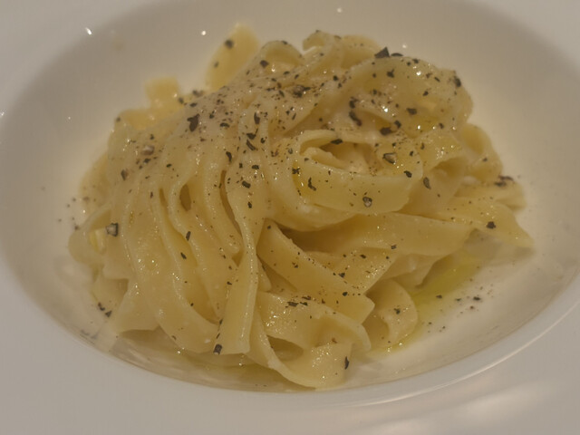 パスタは贅沢に2種類を堪能。「トリュフのパスタ タヤリン」は香りの主張が強く、細めのパスタにトリュフの風味がしっかり絡みます。そして、もう一皿は目の前で仕上げる「20年熟成パルメザンチーズのパスタ」。大きなチーズの中でパスタを和える演出は、分かっていても思わず見入ってしまう華やかさ。味わいも濃厚ながら重すぎず、チーズ好きにはたまらない仕上がりです。