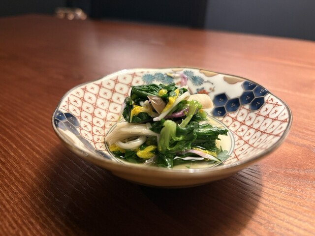 まず運ばれてきた「鶏ワンタンスープ」で、一気に心を掴まれました。鶏の旨味が凝縮された優しいスープが五臓六腑に染み渡ります。続く「きのこと春菊のおひたし」は、素材の香りを活かした上品な味付けで、職人の丁寧な仕事ぶりが伝わってきます。