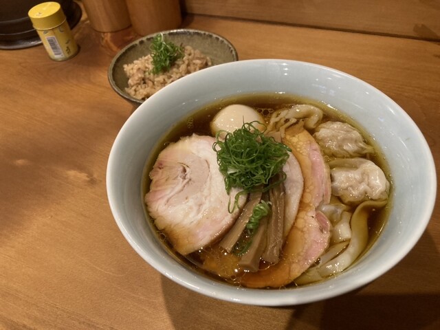 トッピングには豚の肩ロース、バラ、味玉、メンマ、ワンタン、九条ネギ。