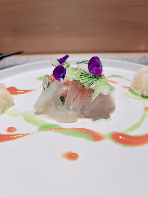 有田焼のオリジナル陶器に入れられた愛媛の法皇キャビアに富山の白海老の下にはトマトとブロッコリーをマヨネーズで和えられた者が敷かれたミルフィーユ仕立ての1品。スプーンで頂くと白海老の甘みとキャビアの塩味が最高!