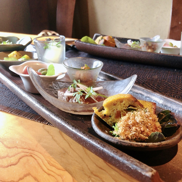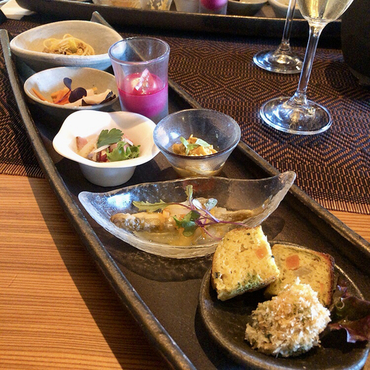 ケークサレワカサギの南蛮、鳥取県産のお豆と干しエビ、大和ポーク、ビーツのムース、低温調理された蒸し鶏、三輪そうめんのパスタ胡麻風味