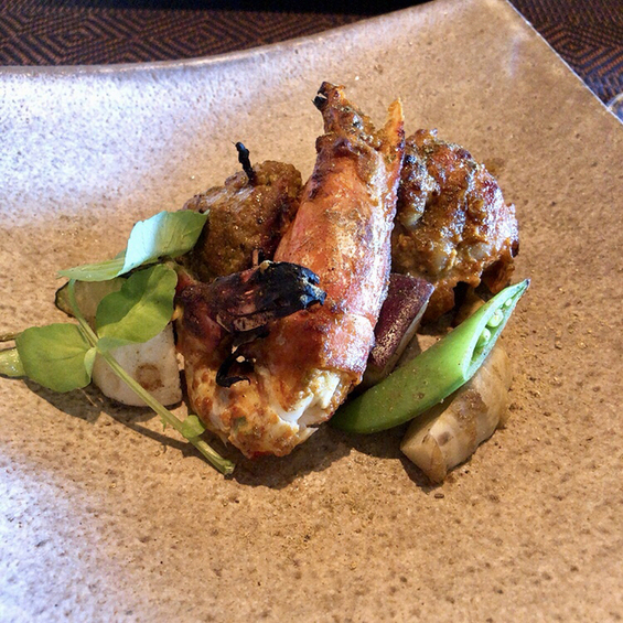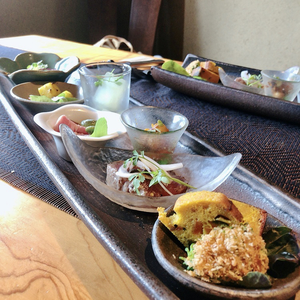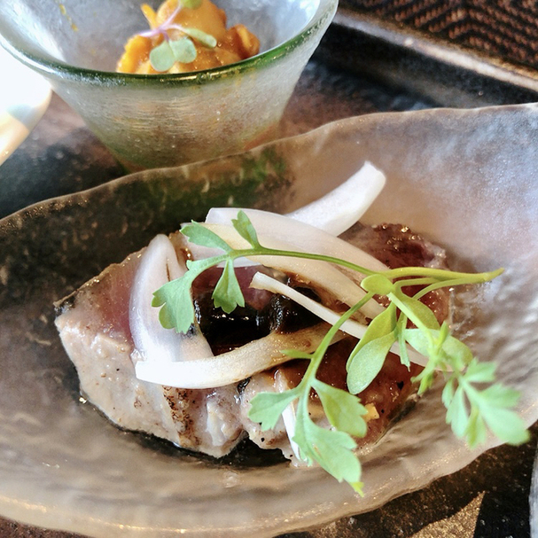 鰹の黒にんにくソースと低温調理された地鶏が美味しかった〜
