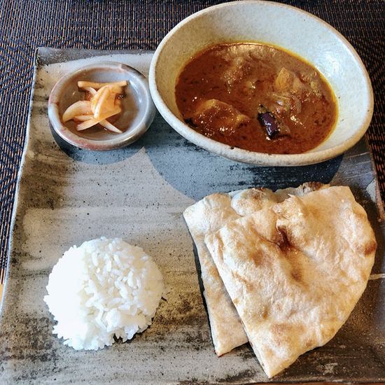 本日のカレーは『茄子とチキンカレー』油通しされた茄子とカレーが良く合い満足感を覚えます。ライスで食べるのも勿論美味しいけど、キメ細かい食感のナンもカレーを上手く包み込む〜やっぱりベストカップルだゎ♡