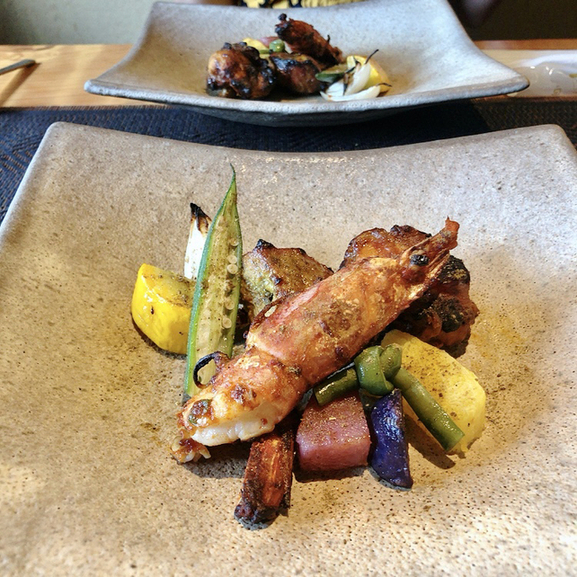 メイン料理 ポーク、えび、タンドリーチキンと奈良県産のお野菜たち