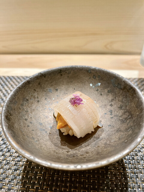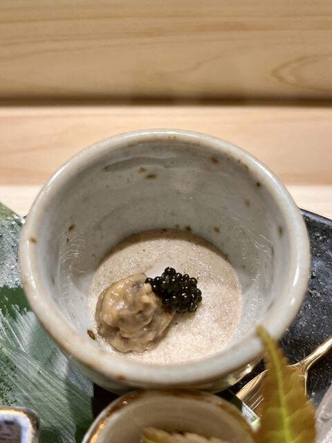 蓮根まんじゅうならぬ「茄子まんじゅう」のもちもち感と餡のとろみ具合がめちゃくちゃ美味しい〜少しねっとりしてるんだけどスッと溶けてく感じが何ともお鮨の中休みを充実させてくれます。