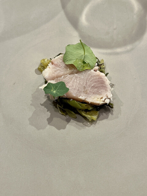 まだ皆んなが静かに眠る時間、シェフが1番旨味が眠るタケノコを掘り起こして来てくれたタケノコを玉ねぎのみを使ったペーストとナスタチウムで頂きました。