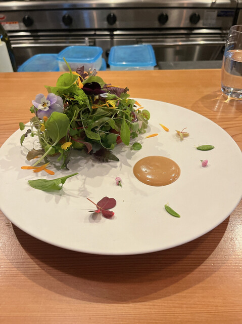 『辛い』『苦い』 『すっぱい』等を味わって欲しい!との想いがあるサラダ。食べれるお花が美しくてヨーロッパのお庭を想像させるような一品。いろんな葉野菜をお塩で頂き、味が足りなければソースを。小さなえんどう豆が可愛かったり葉物野菜の中から、カブや芽キャベツ、今が旬のトマト等が出て来て楽しい〜