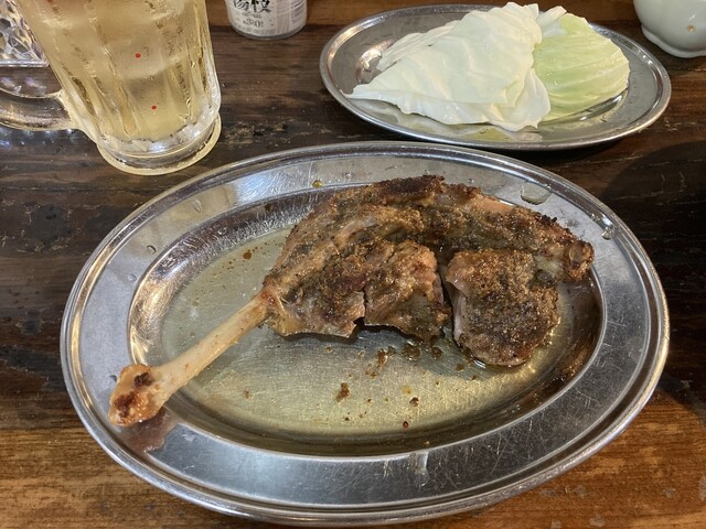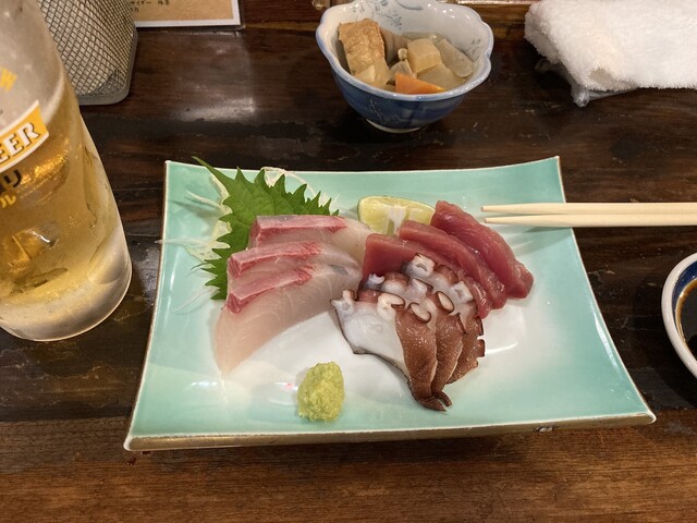ひな鳥をオーダー。焼き上がるまでは刺し盛りで!ここは一品で、お造りやカツオのたたきが有るのが良いですね。ひな鳥が焼き上がります。ここは、はさみを置いてあって、自由に食べやすい大きさに切って食べれるのが良いです。味は胡椒が効いていてスパイシーでひな鳥は柔らかく美味しいです。ここも有名店ですが、あの人気の有名店もいつも行列なんで、こちらのお店の方が、まだ入りやすいかも。味もほとんど変わらないと思いますしね!