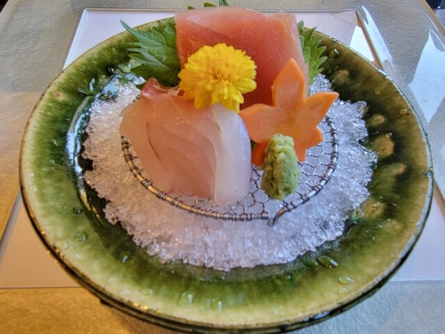 ◇お造り 氷の上に盛り付けられる 鮮魚は カジキマグロ/鯛 の二点盛り 添えるツマは 大葉/食用菊