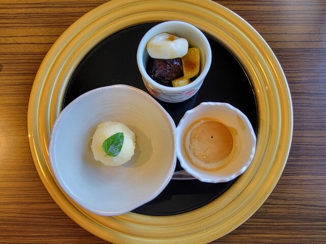 パイナップルシャーベット/プリン/ほうじ茶寒天の餡蜜