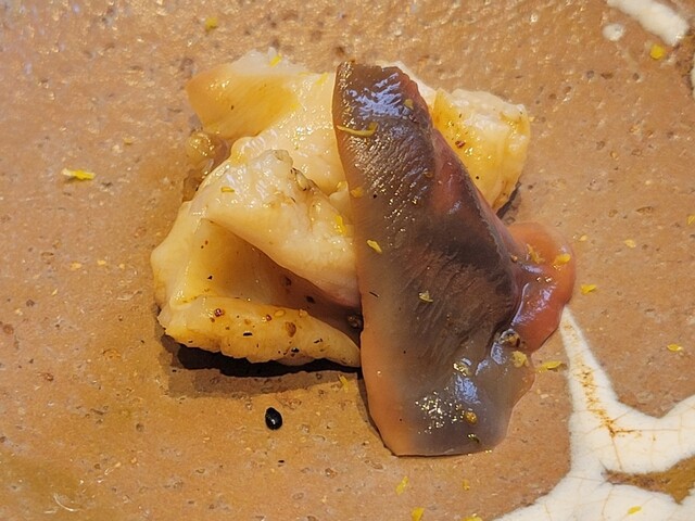 ◆やわらかく仕上げたほっき貝に炙りを加え
